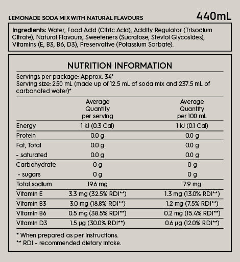 Water, Acid (citric acid), Naturals Flavours, Acidity Regulator (tri sodium citrate), Natural Flavours, Sweeteners (sucralose, steviol glycosides), Preservative (potassium sorbate), Vitamins (B3, E, B6, D3).