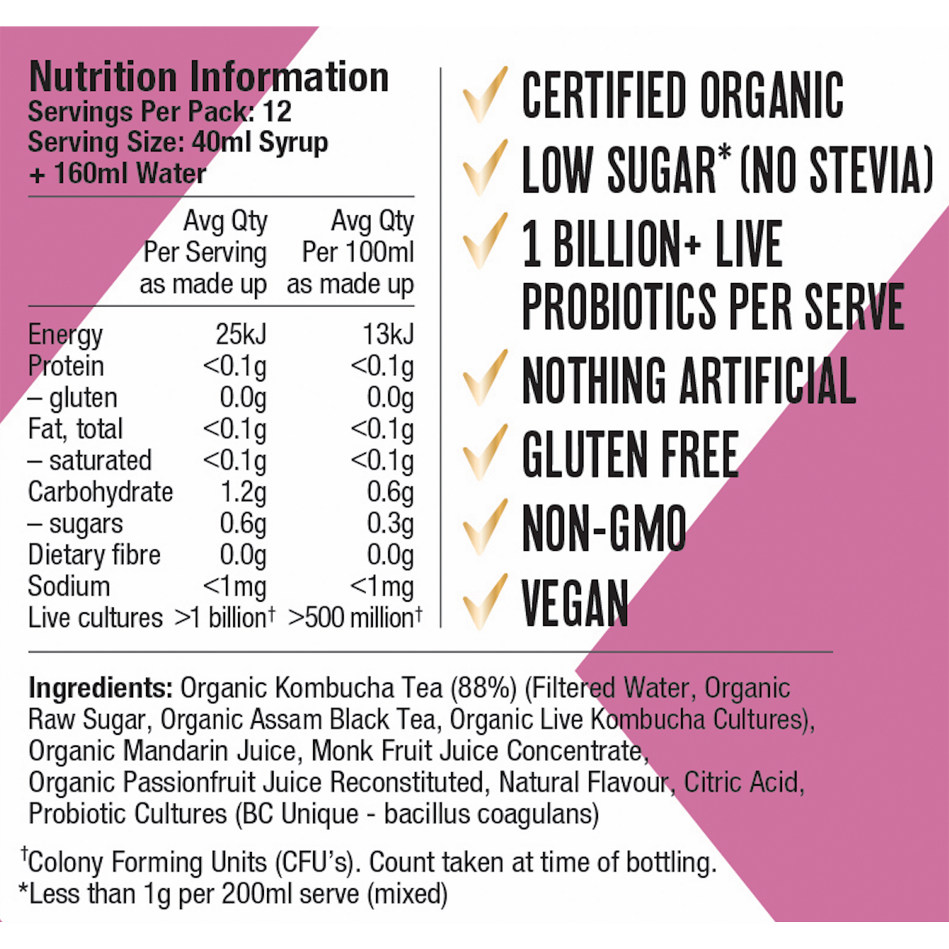 Our Passionfruit & Mandarin Kombucha Concentrate is the ultimate combination of sweet and tart; exotic passionfruit and soft tones of mandarin. Just add sparkling water from your SodaStream machine to make your very own top notch Kombucha.