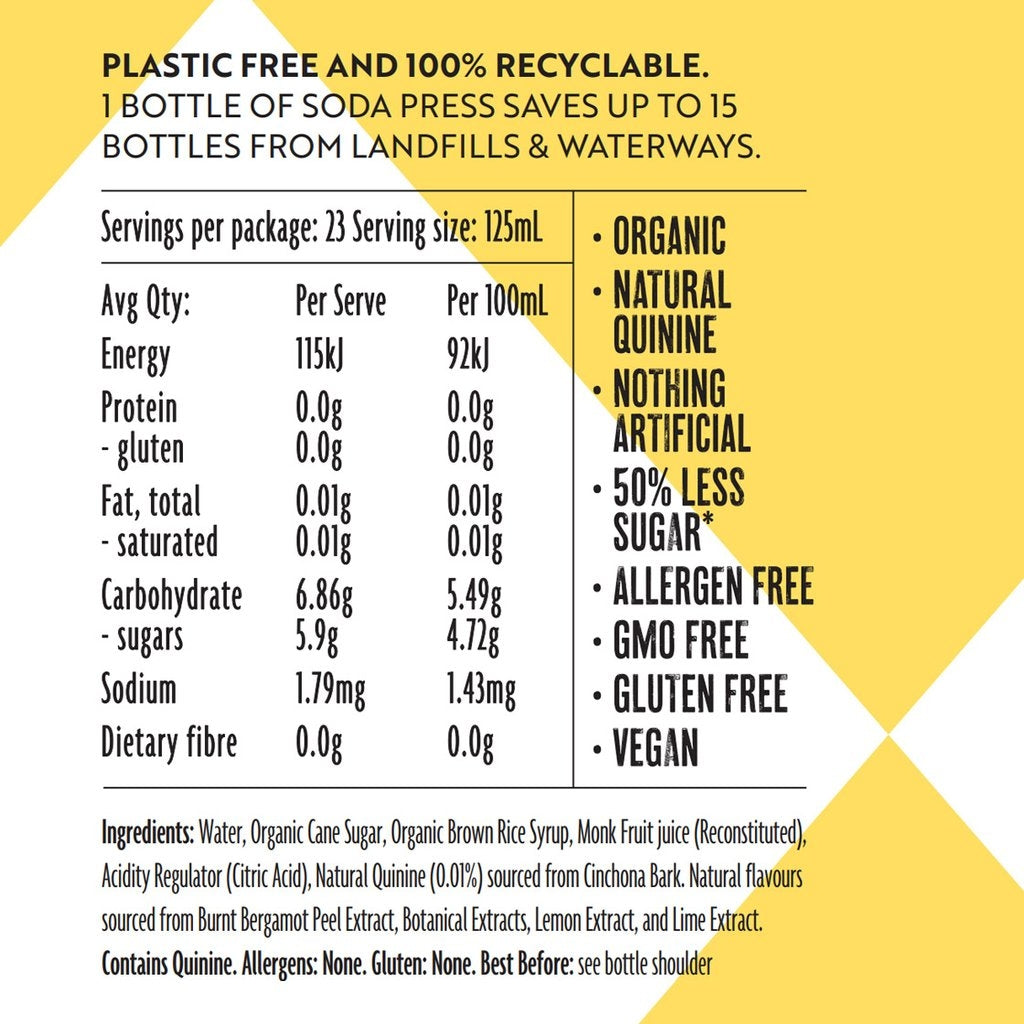 Water , Organic Cane Sugar , Organic Brown Rice Syrup , Acidity Regulator (Citric Acid) , Natural Quinine (0.01%) Sourced From Cinchona Bark. Natural Flavours Sourced From Burnt Bergamot Peel Extract , Botanical Extracts , Lemon Extract , And Lime Extract .